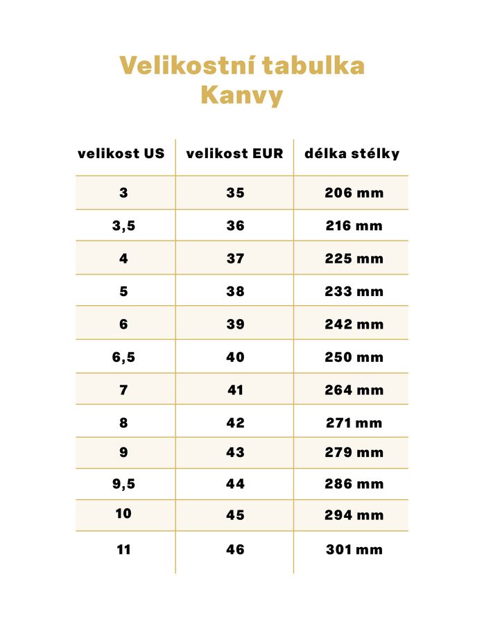 Každý pár je ručně vyroben z nejkvalitnější přírodní pryže a plátna. Podšívka - 100% bavlna Šněrovadlo - 100% bavlna Podešev - lisovaná směs přírodního kaučuku bez lepidla Lemování - 100% bavlna Svršek - 100% bavlna Velikosti 35 – 38 mají řadu 5 kroužků na tkaničky, velikosti 39 a výše mají 6 kroužků. Pozor: Velikosti se liší. Řiďte se, prosím, tabulkou velikostí. U dámských velikostí doporučujeme o číslo větší než standardně.
